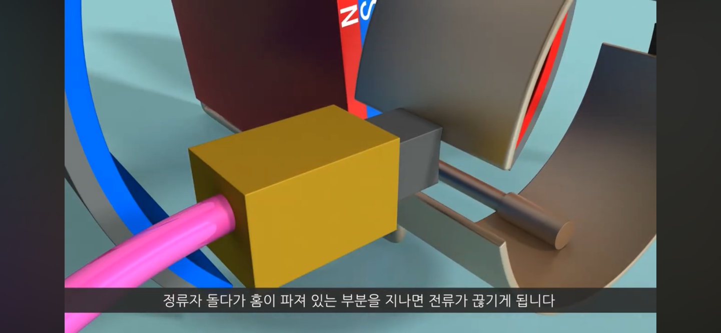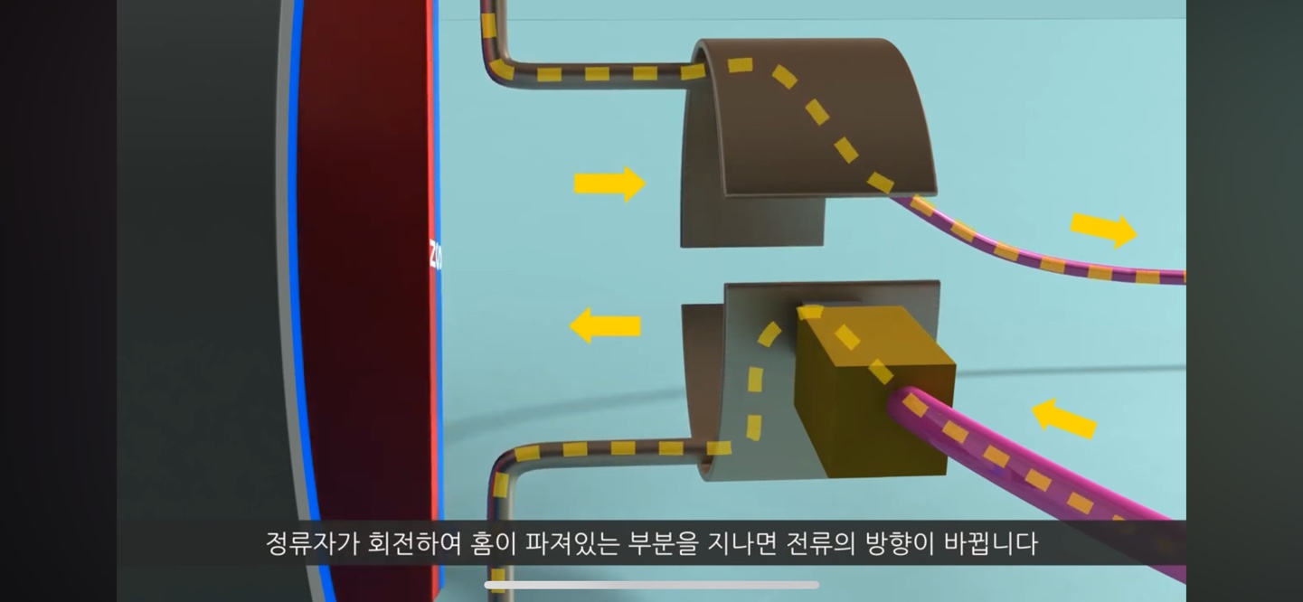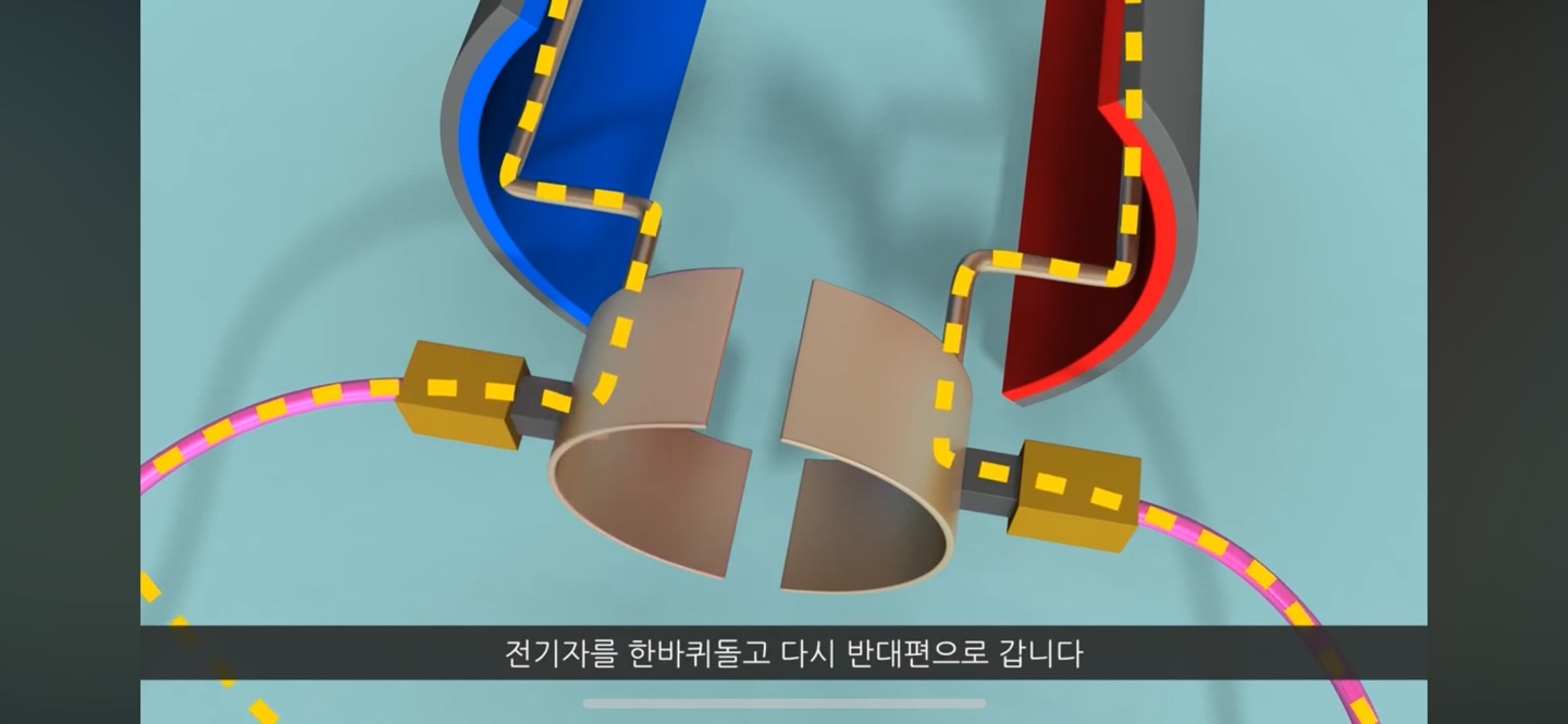 이렇게 전자석의 극 방향을 바뀌게 할 수 있고 이런 원리로 전기자가 계속해서 돌게 됩니다.