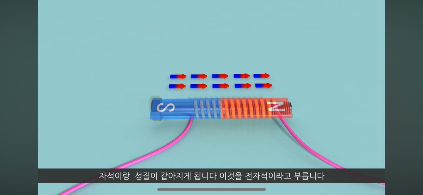 여기에 전선을 감고 전류가 흐르면 일정한 배열이 생기게 되면서 자석이랑 성질이 같아지게 됩니다. 이것을 전자석이라고 합니다. (전기가 흐를 때 자석이 되는 것)